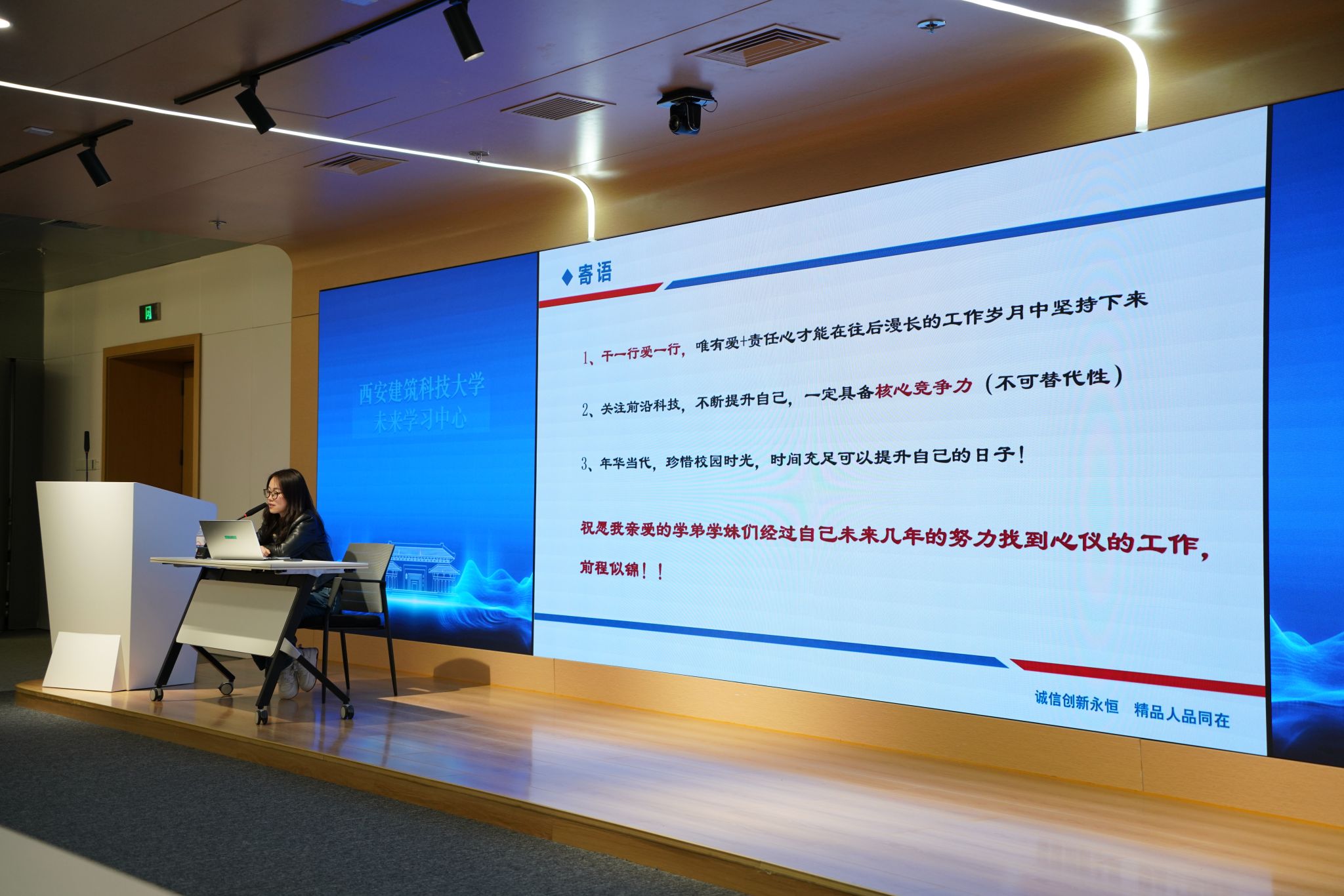张苗苗着重强调在校学生应当时刻保持对行业前沿动态的敏锐关注,积极学习新技术,以此提升自己的核心竞争力。她还指出,职业选择不应被性格所束缚,而应通过深度的自我认知,探寻出一条真正适合自己的职业发展路径。